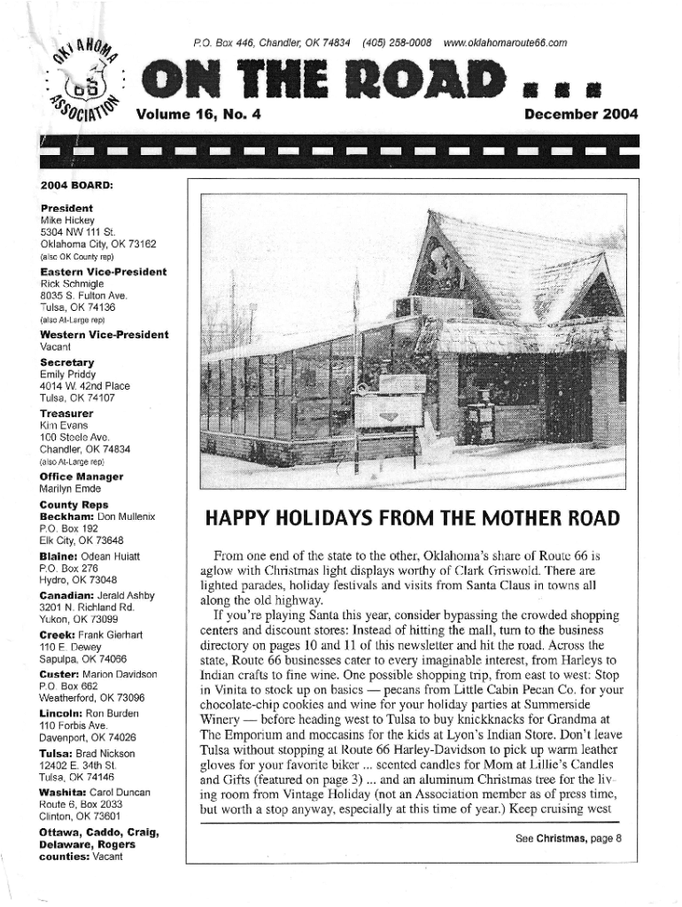 PO. Box 446, Chandler, OK 74834(405) 2580008www.oklahomaroute66.comON THE ROAD December 2004Volume 16, No. 4\'.2004 BOARD:President Mike Hickey 5304 NW 111 St. Oklahoma City, OK 73162 (a lso OK County