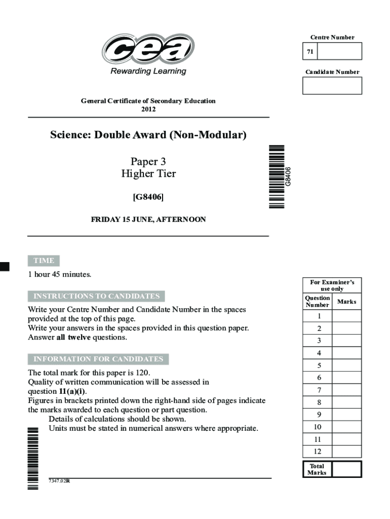 Centre Number 71 Candidate NumberGeneral Certificate of Secondary Education 2012Paper 3 Higher TierG8406Science: Double Award (NonModular)[G8406] FRIDAY 15 JUNE, AFTERNOONTIME1 hour 45 minutes. INSTRUCTIONS