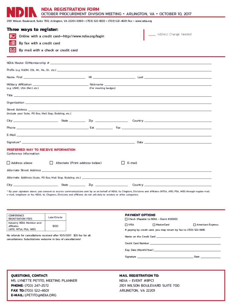 NDIA REGISTRATION FORMOCTOBER PROCUREMENT DIVISION MEETING ARLINGTON, VA OCTOBER 10, 2017 2101 Wilson Boulevard, Suite 700, Arlington, VA 222013060 (703) 5221820 (703) 5224601 Fax www.ndia.orgThree