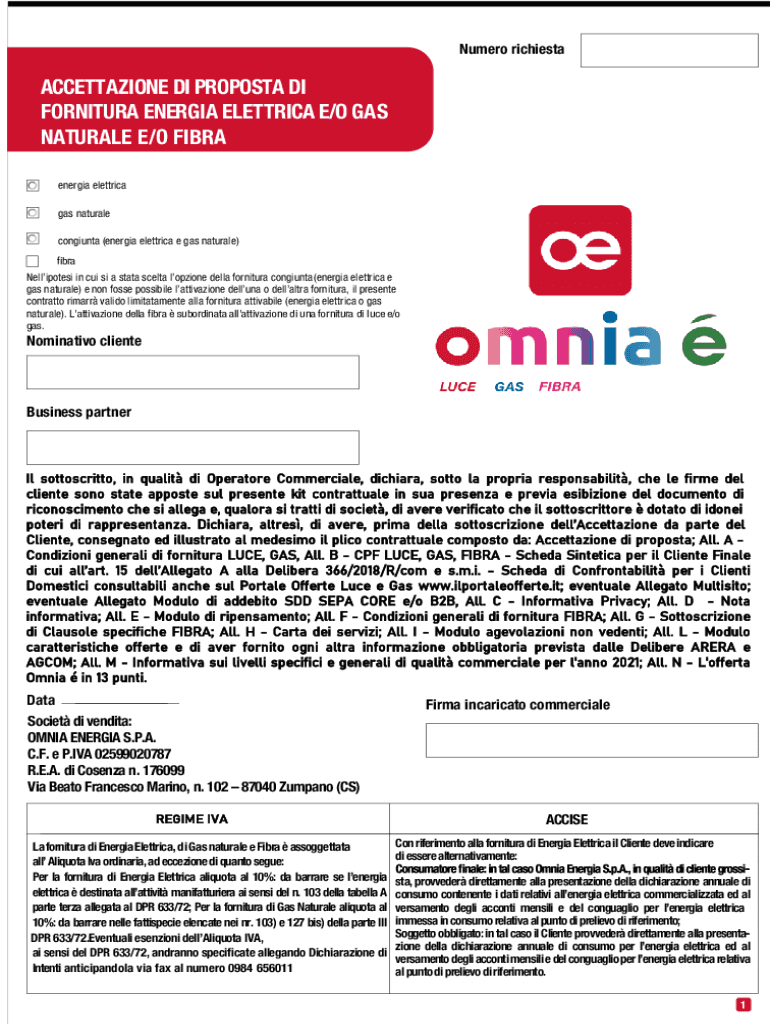 La compilazione di Omnia Energia Spa avviene tramite appositi moduli online o cartacei, dove è necessario fornire dati anagrafici, informazioni sulla fornitura e eventuali riferimenti contrattuali.