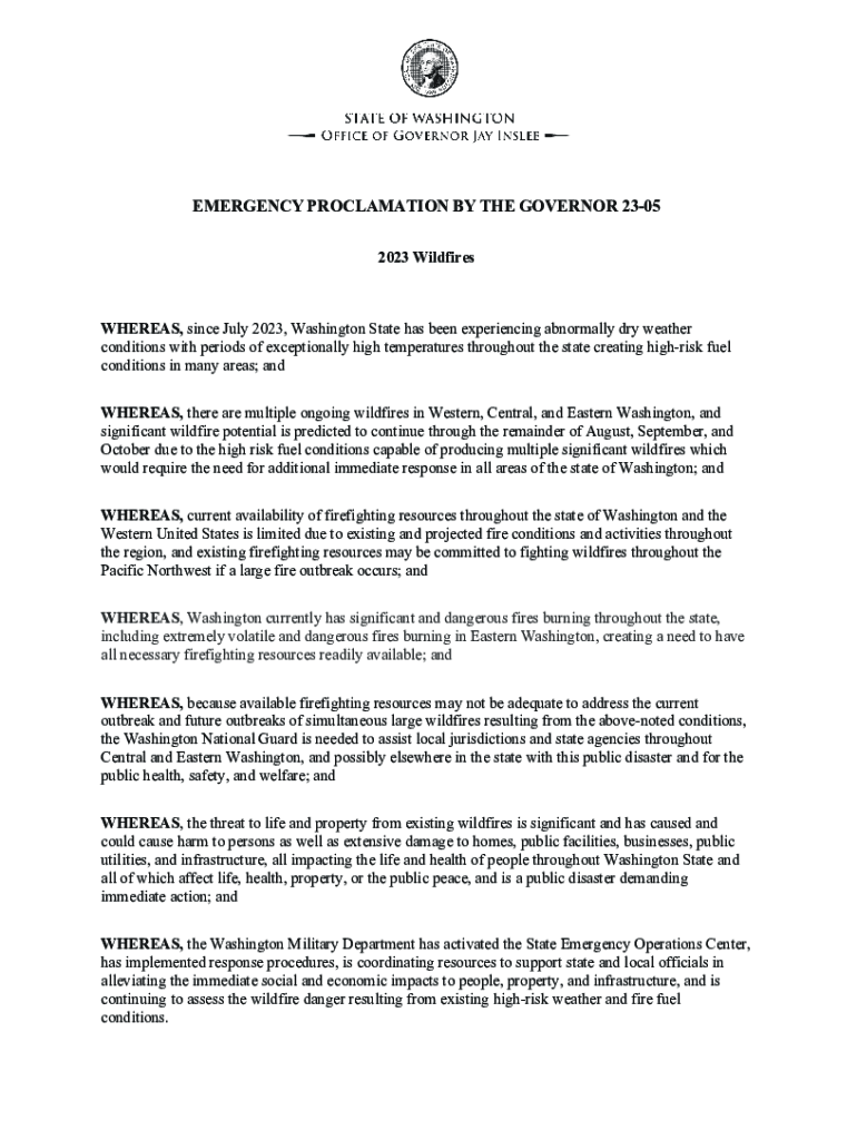 EMERGENCY PROCLAMATION BY THE GOVERNOR 2305 2023 WildfiresWHEREAS, since July 2023, Washington State has been experiencing abnormally dry weather conditions with periods of exceptionally high temperatures