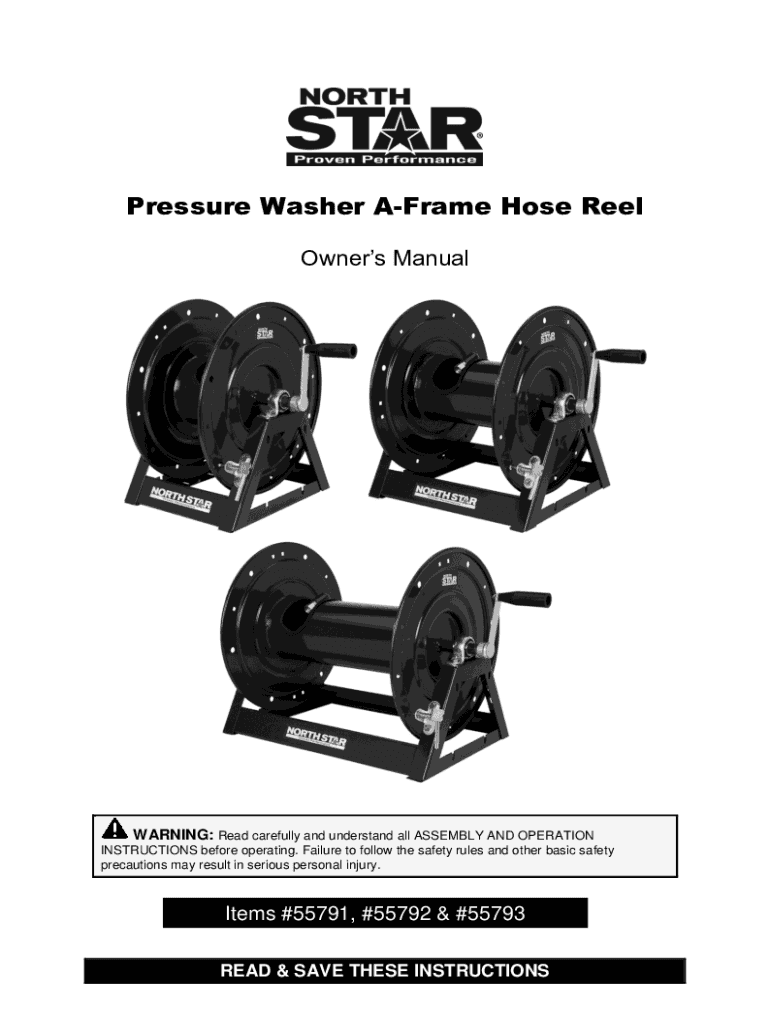 Pressure Washer AFrame Hose Reel Owners ManualWARNING: Read carefully and understand all ASSEMBLY AND OPERATION INSTRUCTIONS before operating. Failure to follow the safety rules and other basic safety