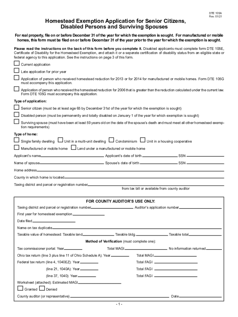 Homestead Exemption Application for Senior Citizens, Disabled Persons and Surviving SpousesDTE 105A Rev. 01/21For real property, file on or before December 31 of the year for which the exemption is