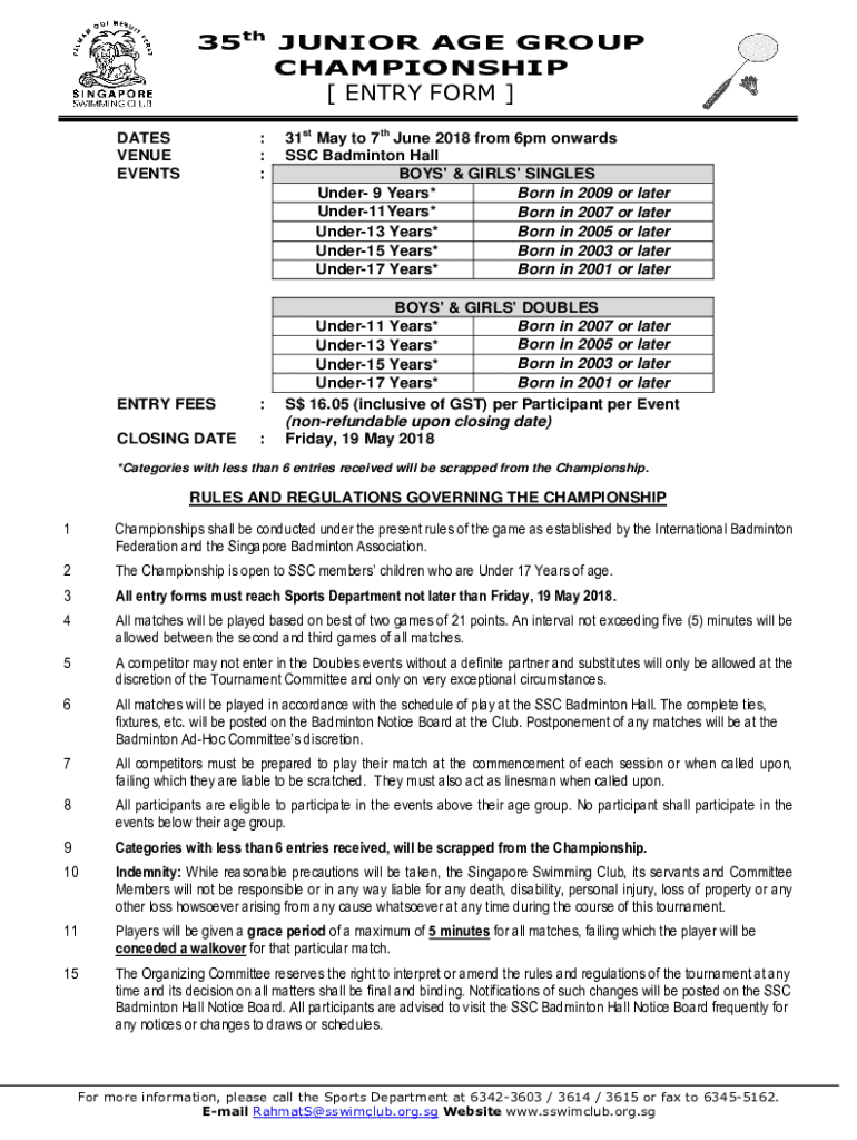 35th JUNIOR AGE GROUP CHAMPIONSHIP[ ENTRY FORM ] DATES VENUE EVENTS: : :ENTRY FEES:CLOSING DATE:31st May to 7th June 2018 from 6pm onwards SSC Badminton Hall BOYS & GIRLS SINGLES Under 9 Years* Born