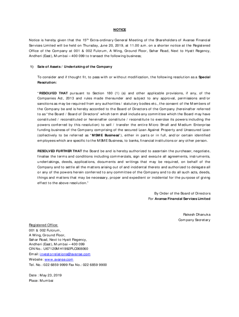 NOTICE Notice is hereby given that the 15th Extraordinary General Meeting of the Shareholders of Avanse Financial Services Limited will be held on Thursday, June 20, 2019, at 11.00 a.m. on a shorter