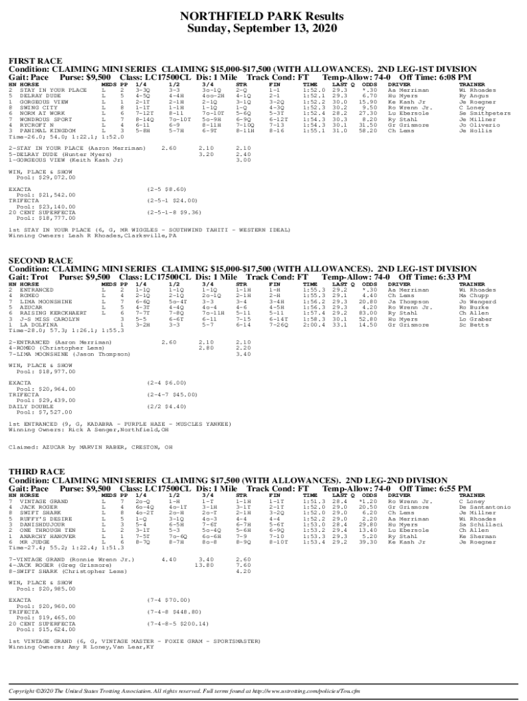 NORTHFIELD PARK Results Sunday, September 13, 2020 FIRST RACE Condition: CLAIMING MINI SERIES CLAIMING $15,000$17,500 (WITH ALLOWANCES). 2ND LEG1ST DIVISION Gait: Pace Purse: $9,500 Class: LC17500CL