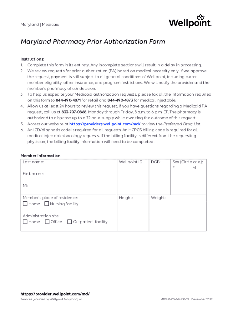 Maryland | MedicaidMaryland Pharmacy Prior Authorization Form Instructions: 1. Complete this form in its entirety. Any incomplete sections will result in a delay in processing. 2. We review requests