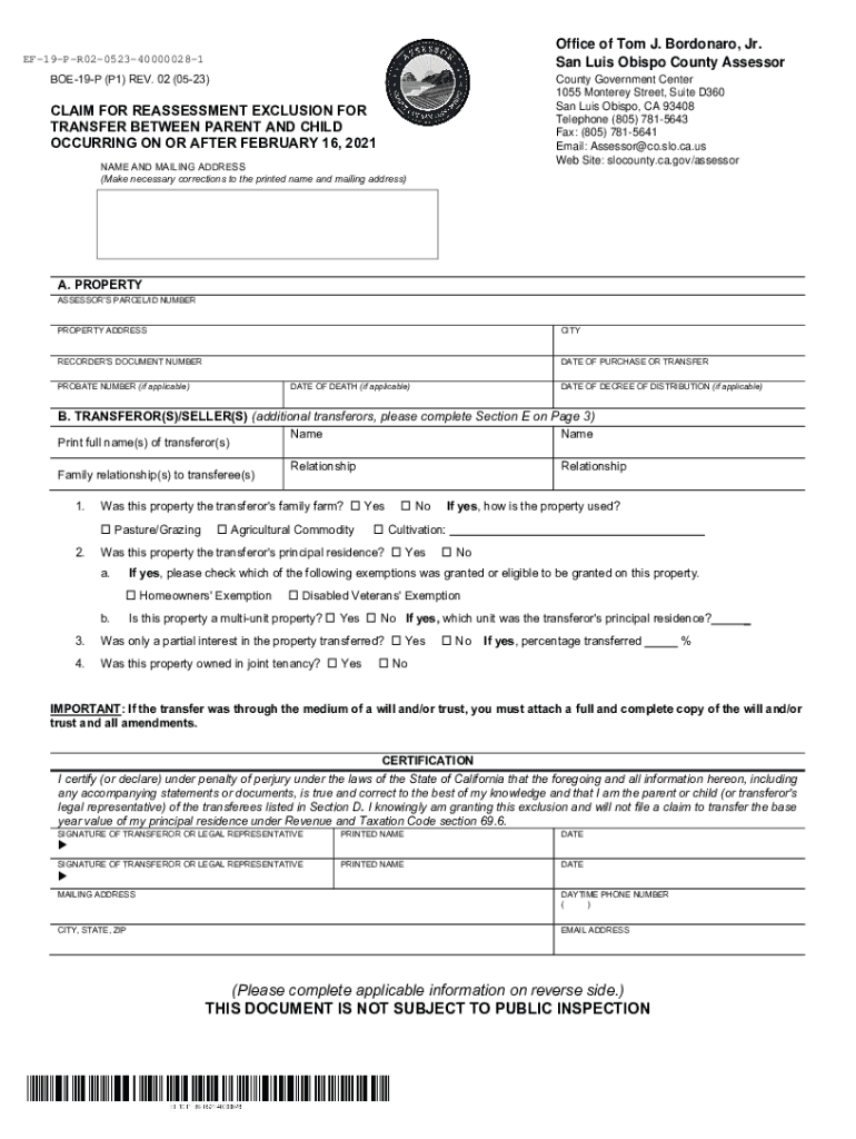 Office of Tom J. Bordonaro, Jr. San Luis Obispo County AssessorEF19PR020523400000281BOE19P (P1) REV. 02 (0523)County Government Center 1055 Monterey Street, Suite D360 San Luis Obispo, CA 93408 Telephone