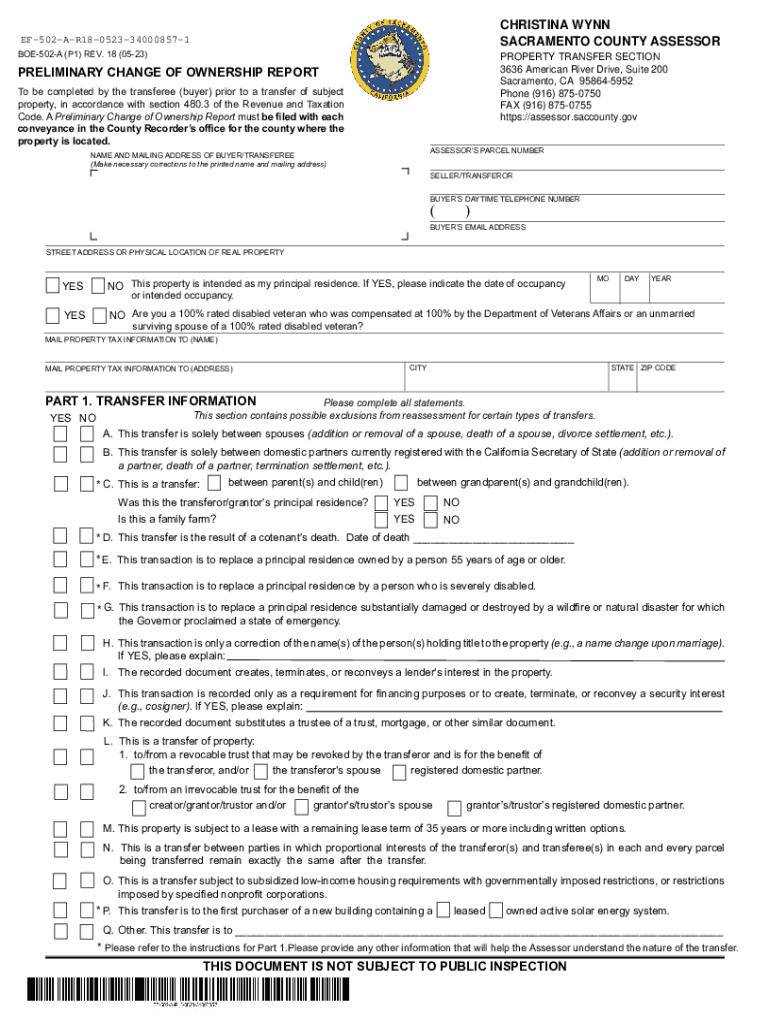 CHRISTINA WYNN SACRAMENTO COUNTY ASSESSOREF502AR180523340008571 BOE502A (P1) REV. 18 (0523)PROPERTY TRANSFER SECTION 3636 American River Drive, Suite 200 Sacramento, CA 958645952 Phone (916) 8750750