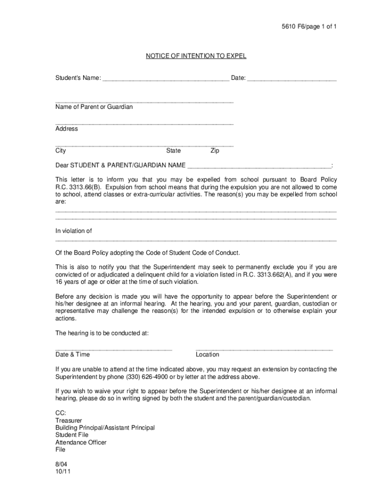 5610 F6/page 1 of 1NOTICE OF INTENTION TO EXPELStudent\'s Name: ___ Date: ______ Name of Parent or Guardian ___ Address ___ City State Zip Dear STUDENT & PARENT/GUARDIAN NAME ___: This letter is to