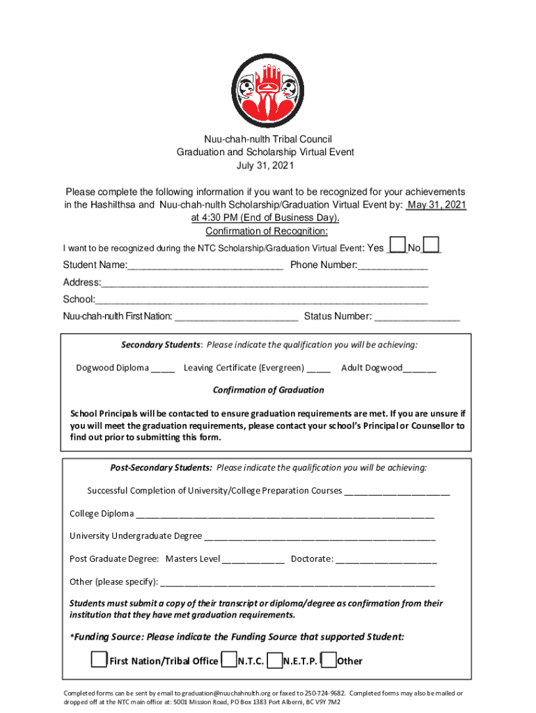 Invitation to the Nuuchahnulth Tribal Council Graduation and Scholarship Virtual Event July 31, 2021 This year, the Nuuchahnulth Tribal Council will hold a Virtual event for both the graduation ceremony