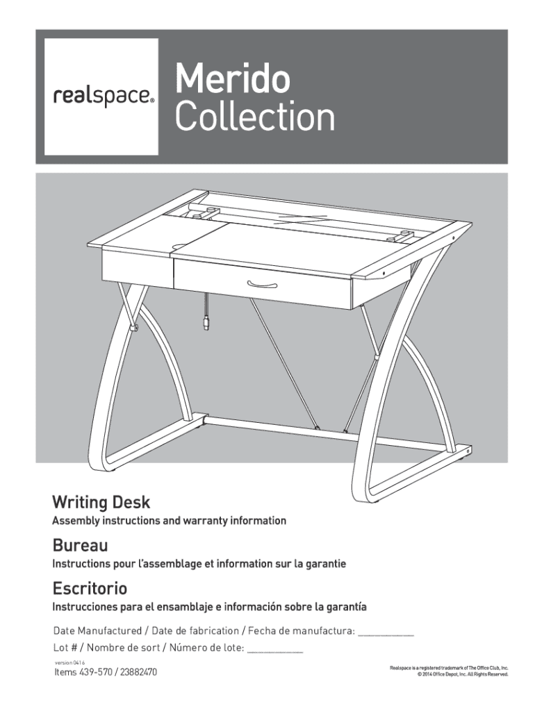Date Manufactured / Date de fabrication / Fecha de manufactura: ___ Lot # / Nombre de sort / Nmero de lote: ___ version 0416Items 439570 / 23882470WarningPlease use your furniture correctly and safely.
