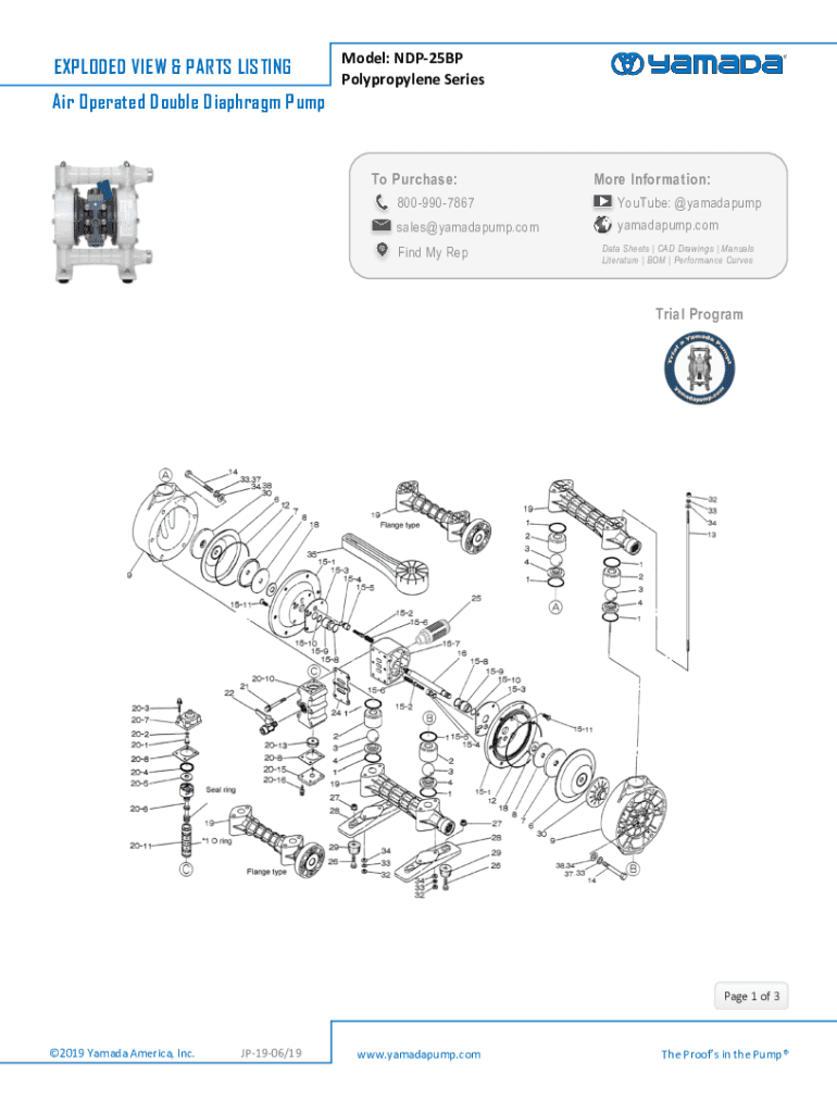 EXPLODED VIEW & P ARTS LISTINGModel: NDP25BP Polypropylene SeriesAir Operated Double Diaphragm P umpTo Purchase:More Information:8009907867YouTube: @yamadapumpsales@yamadapump.comyamadapump.comFind
