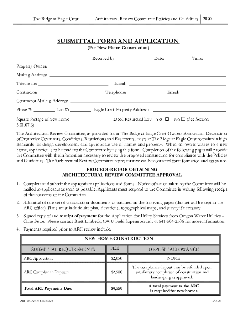 The Ridge at Eagle CrestArchitectural Review Committee Policies and Guidelines 2020SUBMITTAL FORM AND APPLICATION (For New Home Construction)Received by: ___ Date: ___ Time: ___ Property Owner: ___