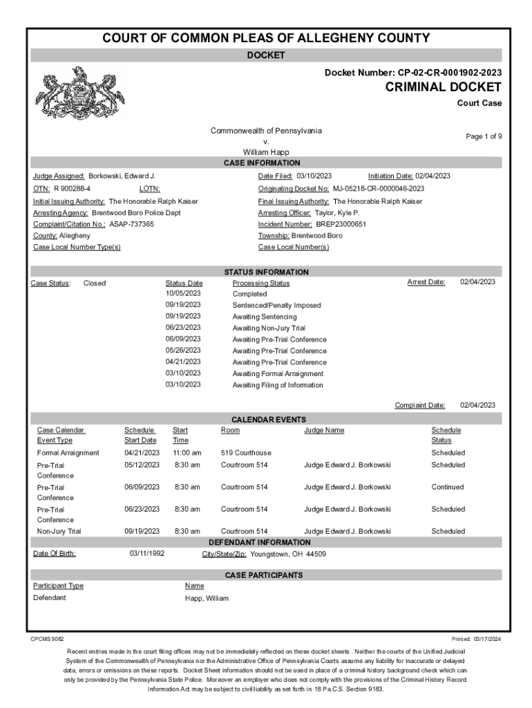 COURT OF COMMON PLEAS OF ALLEGHENY COUNTY DOCKET Docket Number: CP02CR00019022023CRIMINAL DOCKET Court Case Commonwealth of Pennsylvania v. William Happ CASE INFORMATIONPage 1 of 9Judge Assigned: