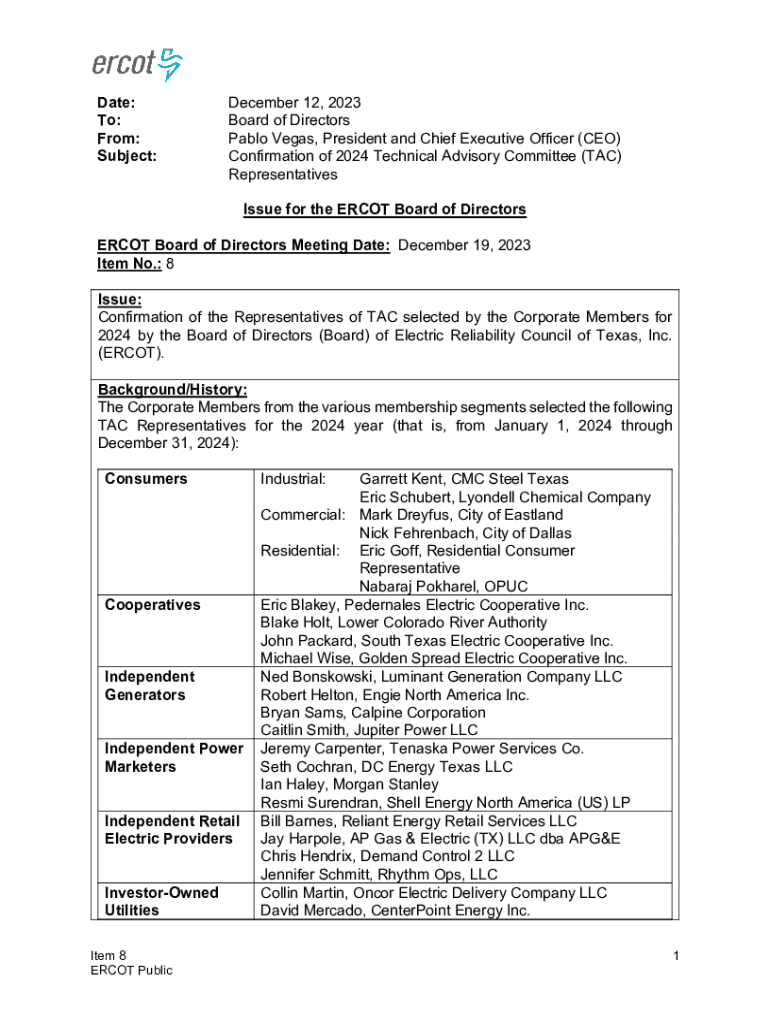 Date: To: From: Subject:December 12, 2023 Board of Directors Pablo Vegas, President and Chief Executive Officer (CEO) Confirmation of 2024 Technical Advisory Committee (TAC) Representatives Issue