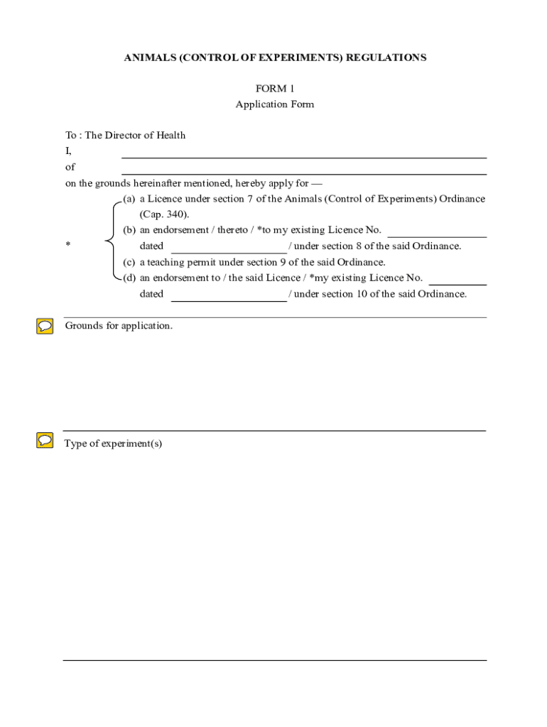 ANIMALS (CONTROL OF EXPERIMENTS) REGULATIONS FORM 1 Application Form To : The Director of Health I, of on the grounds hereinafter mentioned, hereby apply for (a) a License under section 7 of the Animals