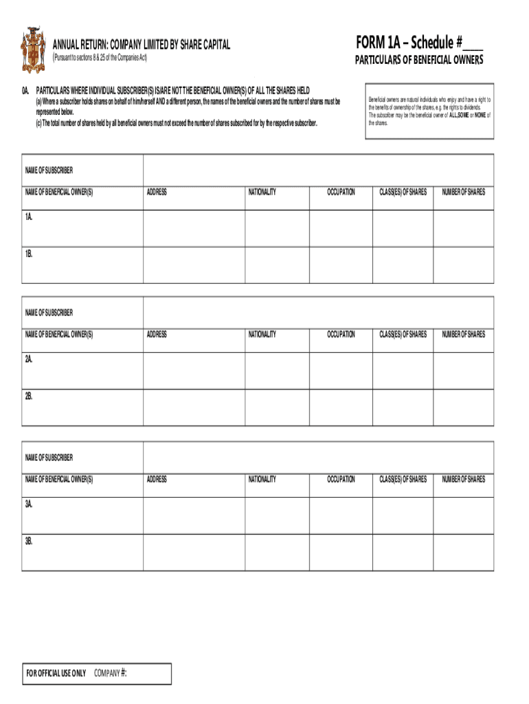 FORM 1A Schedule #___ANNUAL RETURN: COMPANY LIMITED BY SHARE CAPITAL (Pursuant to sections 8 & 25 of the Companies Act)PARTICULARS OF BENEFICIAL OWNERS 0A.PARTICULARS WHERE INDIVIDUAL SUBSCRIBER(S)