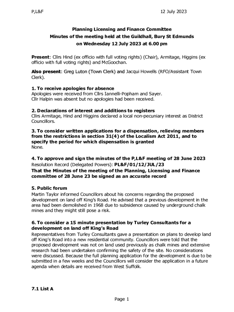 Minutes of the meeting held at the Guildhall, Bury St Edmund son Wednesday 12 July 2023 at 6.00 pm