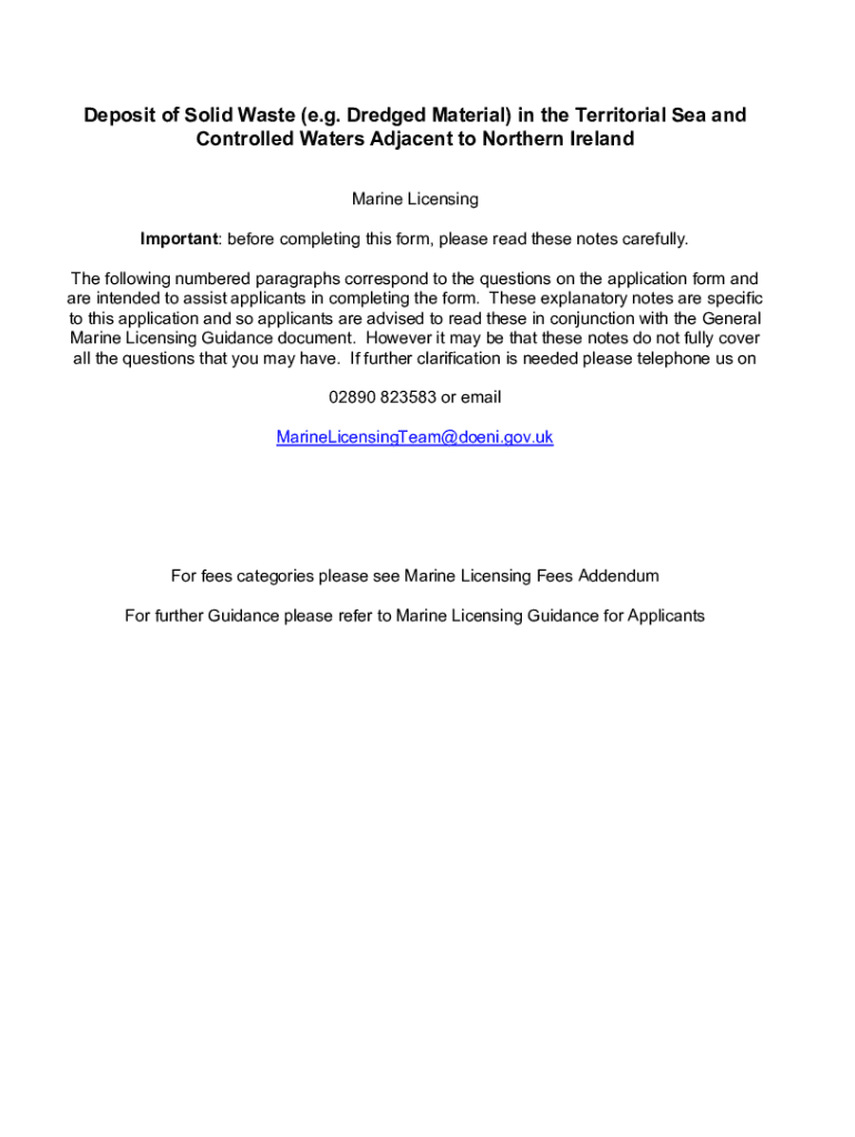 Deposit of Solid Waste (e.g. Dredged Material) in the Territorial Sea and Controlled Waters Adjacent to Northern Ireland Marine Licensing Important: before completing this form, please read these