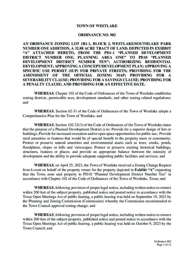 TOWN OF WESTLAKE ORDINANCE NO. 982 AN ORDINANCE ZONING LOT 1R11, BLOCK 2, WESTLAKE/SOUTHLAKE PARK NUMBER ONE ADDITION, A 32.88 ACRE TRACT OF LAND, DEPICTED IN EXHIBIT A ATTACHED HERETO, FROM THE PD11