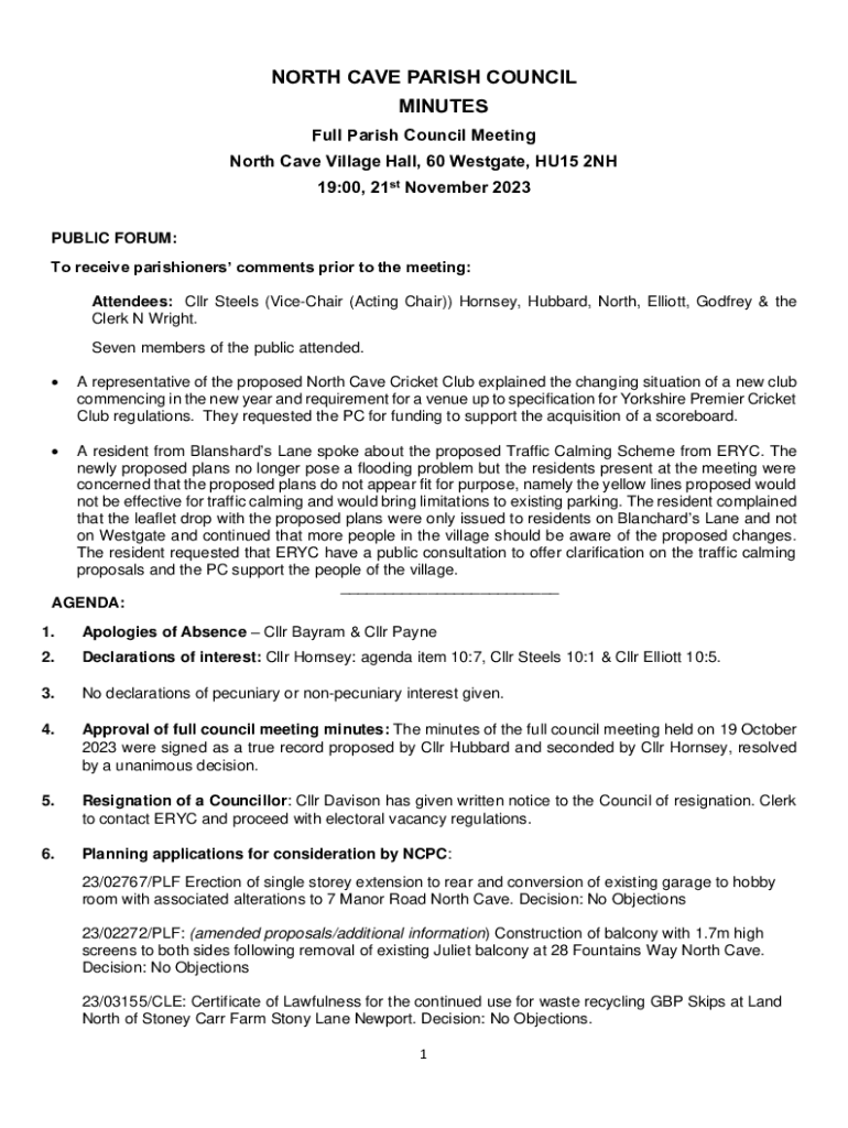 NORTH CAVE PARISH COUNCIL MINUTES Full Parish Council Meeting North Cave Village Hall, 60 Westgate, HU15 2NH 19:00, 21st November 2023 PUBLIC FORUM: To receive parishioners comments prior to the meeting: