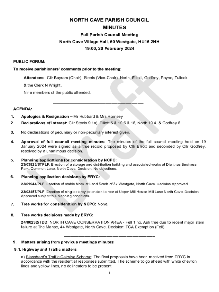 NORTH CAVE PARISH COUNCIL MINUTES Full Parish Council Meeting North Cave Village Hall, 60 Westgate, HU15 2NH 19:00, 20 February 2024 PUBLIC FORUM: : Attendees: Cllr Bayram (Chair), Steels (ViceChair),