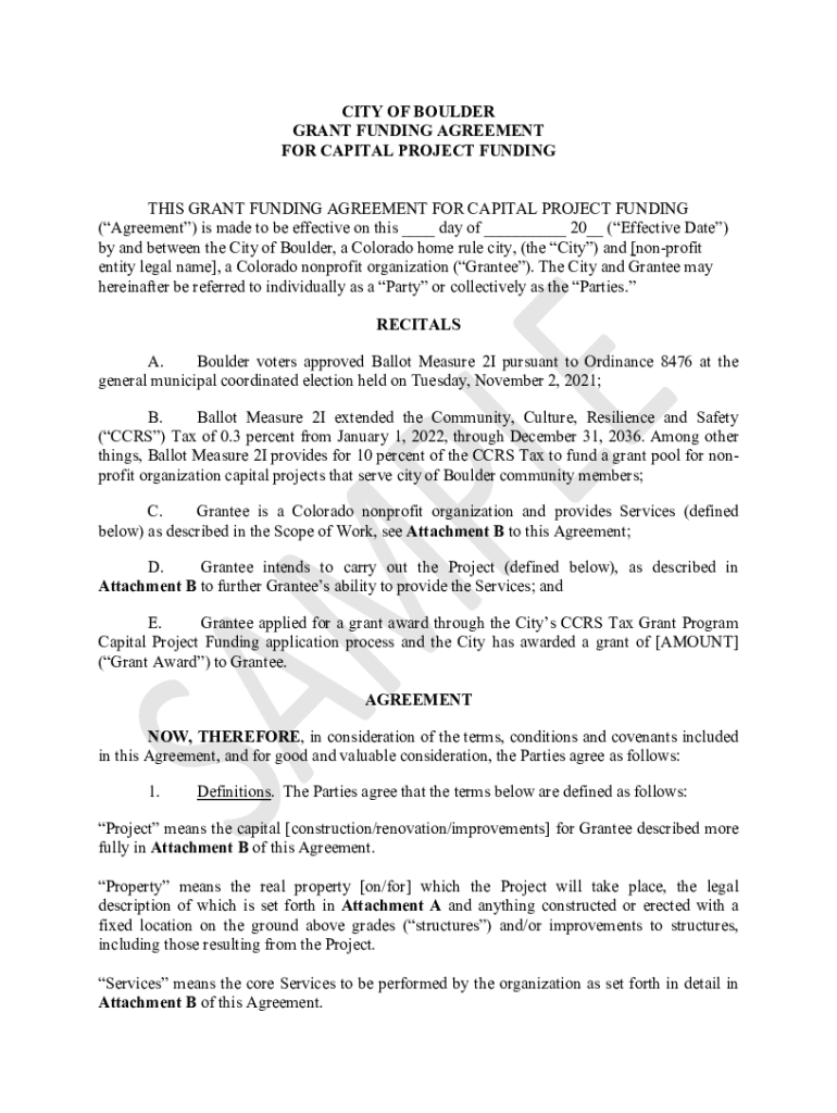 CITY OF BOULDER GRANT FUNDING AGREEMENT FOR CAPITAL PROJECT FUNDING THIS GRANT FUNDING AGREEMENT FOR CAPITAL PROJECT FUNDING (Agreement) is made to be effective on this ___ day of ___ 20__ (Effective