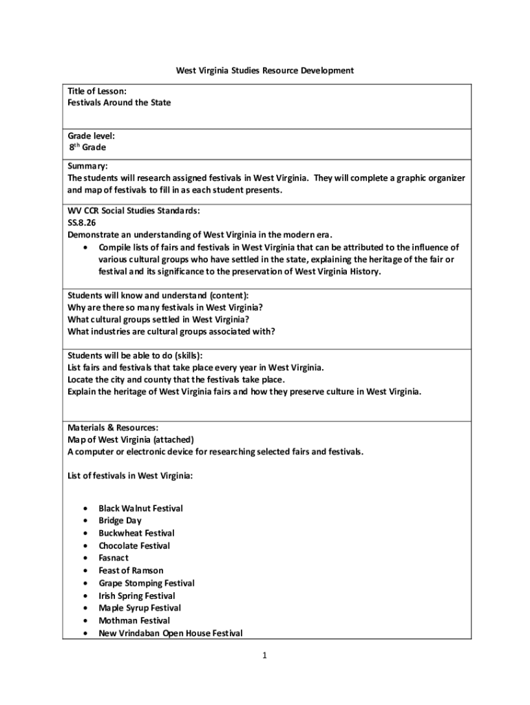 West Virginia Studies Resource Development Title of Lesson: Festivals Around the State Grade level: 8th Grade Summary: The students will research assigned festivals in West Virginia. They will complete