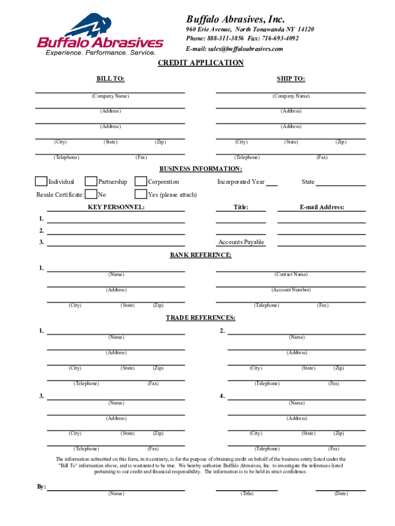 Buffalo Abrasives, Inc. 960 Erie Avenue, North Tonawanda NY 14120 Phone: 8883113856 Fax: 7166934092 Email: sales@buffaloabrasives.comCREDIT APPLICATION BILL TO:SHIP TO:(Company Name)(Company Name)(Address)(Address)(Address)(Address)(City)(State)(Zip)(Telephone)(City)(Fax)(State)(Zip)(Telephone)(Fax)BUSINESS
