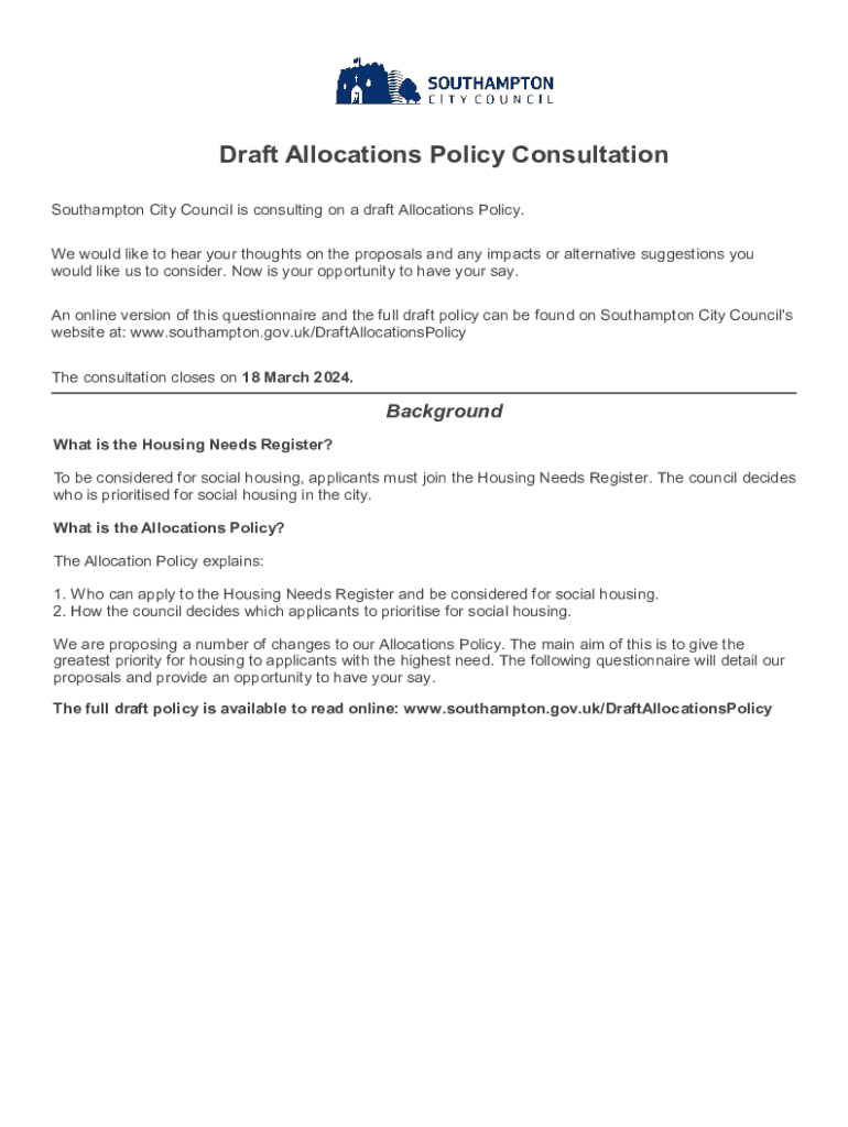 Draft Allocations Policy Consultation Southampton City Council is consulting on a draft Allocations Policy. We would like to hear your thoughts on the proposals and any impacts or alternative suggestions