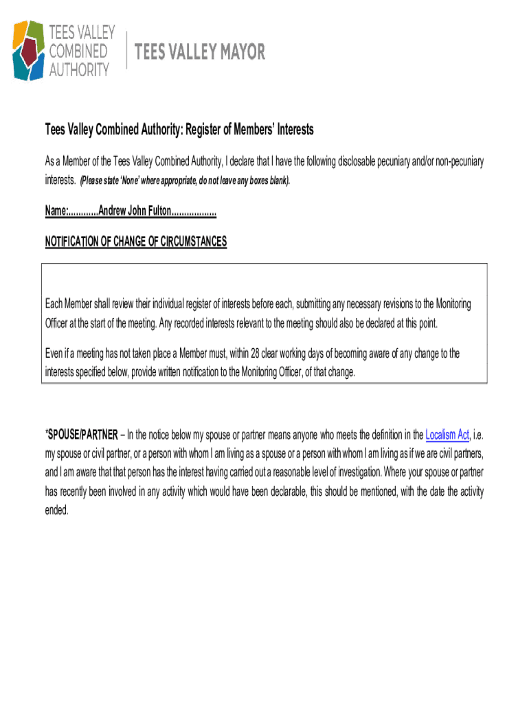 Tees Valley Combined Authority: Register of Members Interests As a Member of the Tees Valley Combined Authority, I declare that I have the following disclosable pecuniary and/or nonpecuniary interests.
