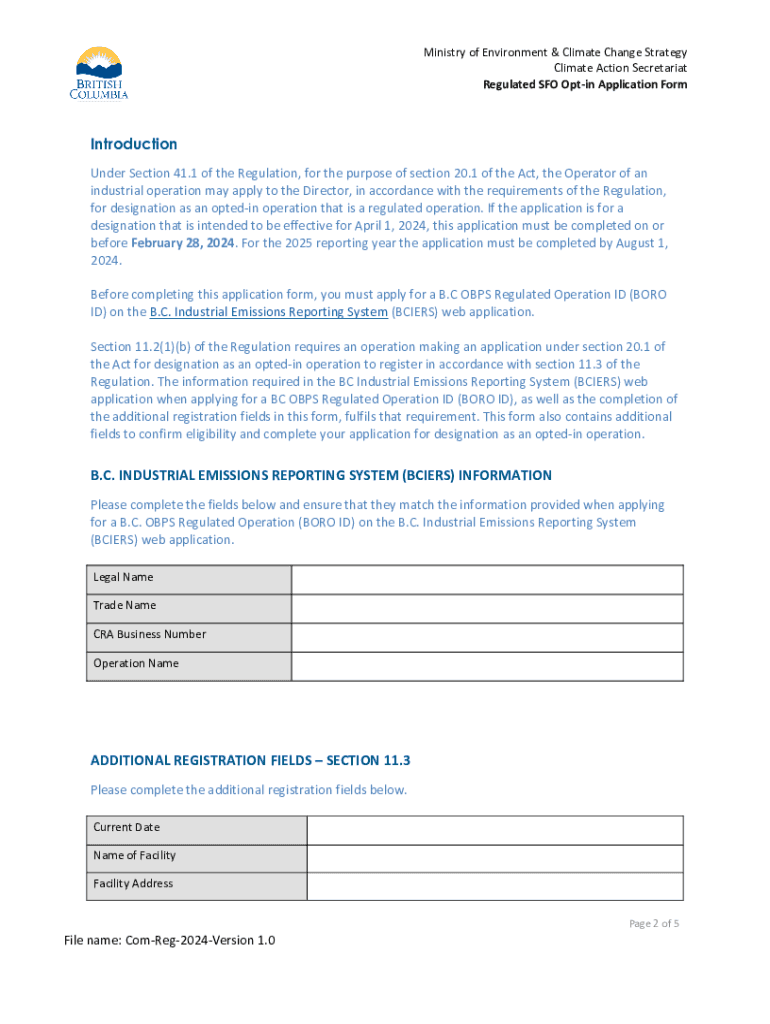 Ministry of Environment & Climate Change Strategy Climate Acon SecretariatRegulated SFO OptIn Applicaon Form Template Version 1.0 January 2024This form is prepared according to the requirements of