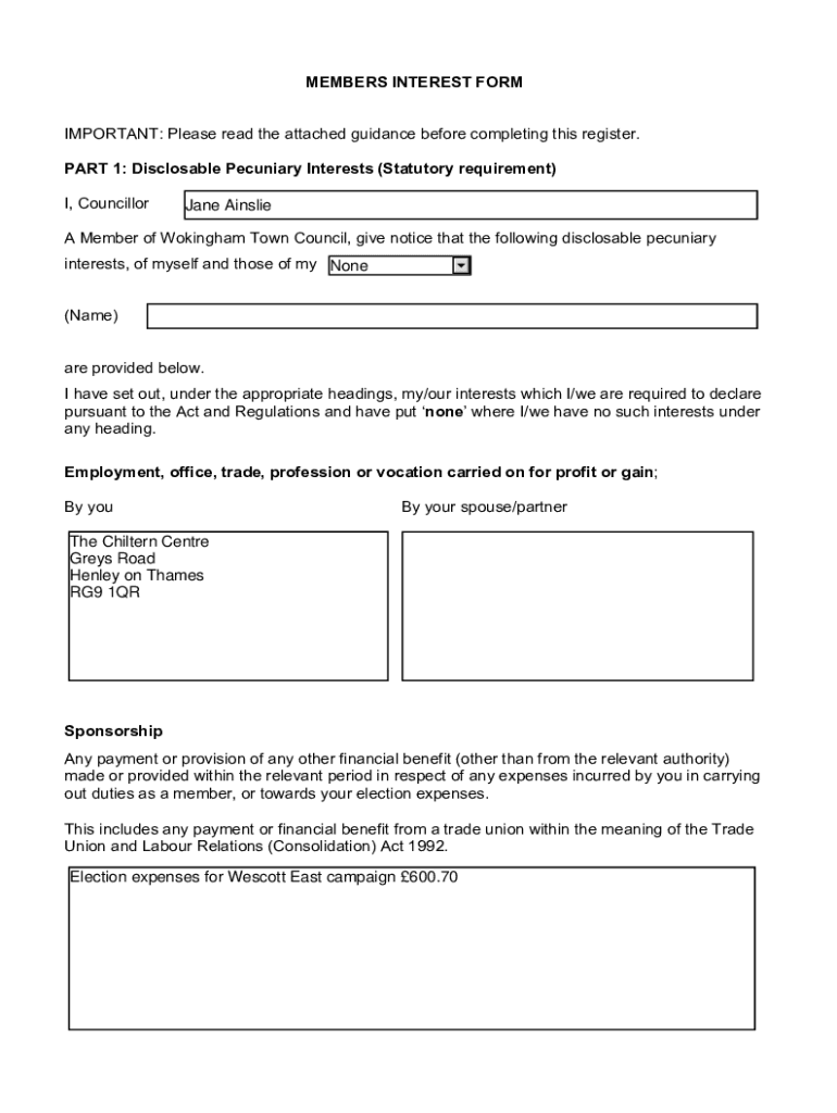 ROCKINGHAM TOWN COUNCIL Guidance for filling in your Members Interest Form This guidance should help you fill in your Members Interest Form, which is required by both the Loyalism Act 2011, and also