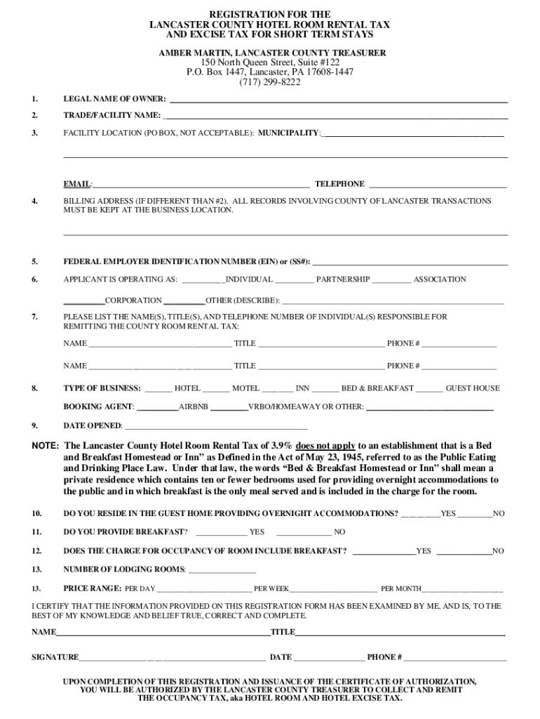 REGISTRATION FOR THE LANCASTER COUNTY HOTEL ROOM RENTAL TAX AND EXCISE TAX FOR SHORT TERM STAYS AMBER MARTIN, LANCASTER COUNTY TREASURER150 North Queen Street, Suite #122 P.O. Box 1447, Lancaster,