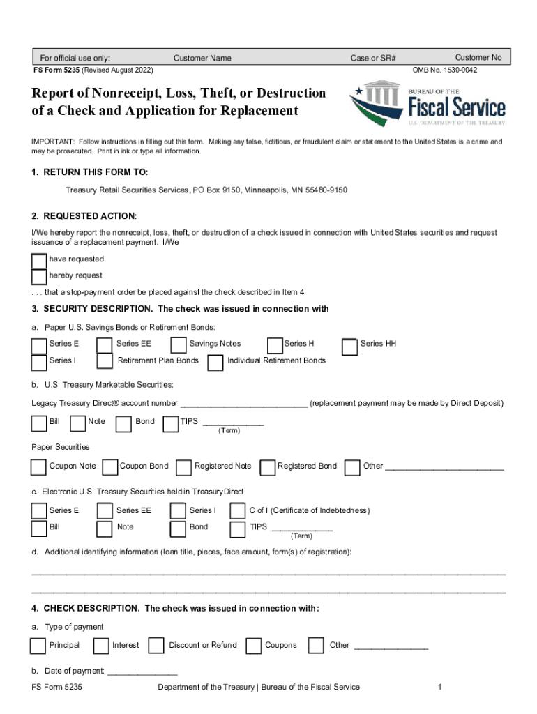 RESETFor official use only:Customer NoCase or SR#Customer NameFS Form 5235 (Revised August 2022)OMB No. 15300042Report of Nonreceipt, Loss, Theft, or Destruction of a Check and Application for Replacement