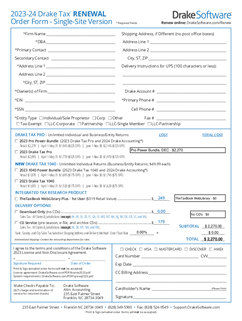 202324 Drake Tax RENEWAL Order Form SingleS ite Version Renew online: DrakeSoftware.com/Renew* Required Fields×Firm Name___Shipping Address, if Different (no post office boxes)*DBA___Address Line