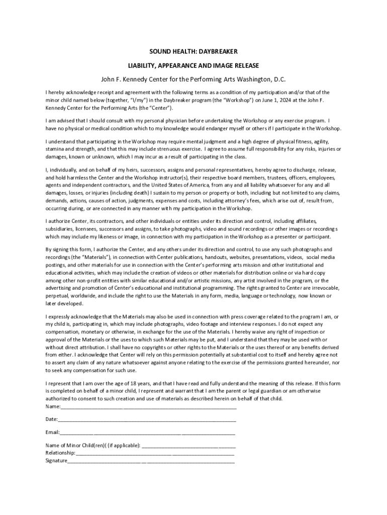 SOUND HEALTH: DAYBREAKER LIABILITY, APPEARANCE AND IMAGE RELEASE John F. Kennedy Center for the Performing Arts Washington, D.C. I hereby acknowledge receipt and agreement with the following terms