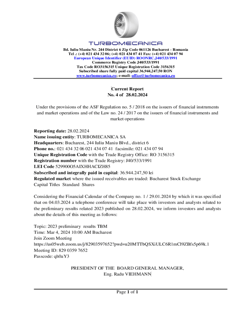 Bd. Iuliu Maniu Nr. 244 District 6 Zip Code 061126 Bucharest Romania Tel .: (+4) 021 434 32 06; (+4) 021 434 07 41 Fax: (+4) 021 434 07 94 European Unique Identifier (EUID) ROONRC.J40/533/1991 Commerce