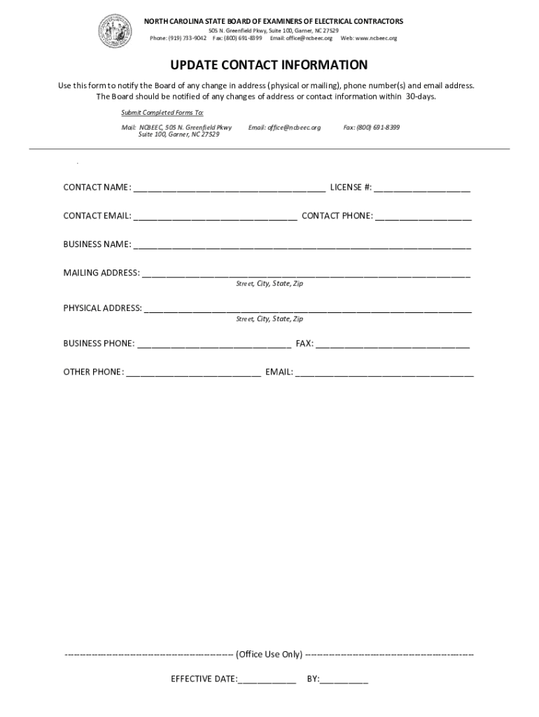 NORTH CAROLINA STATE BOARD OF EXAMINERS OF ELECTRICAL CONTRACTORS Phone: (919) 7339042505 N. Greenfield Pkwy, Suite 100, Garner, NC 27529 Fax: (800) 6918399 Email: office@ncbeec.org Web: www.ncbeec.orgUPDATE