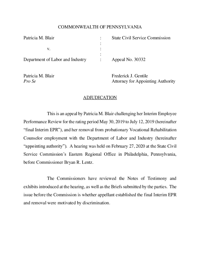 COMMONWEALTH OF PENNSYLVANIA Patricia M. Blair v. Department of Labor and Industry: : : : :Patricia M. Blair Pro SeState Civil Service CommissionAppeal No. 30332Frederick J. Gentile Attorney for Appointing