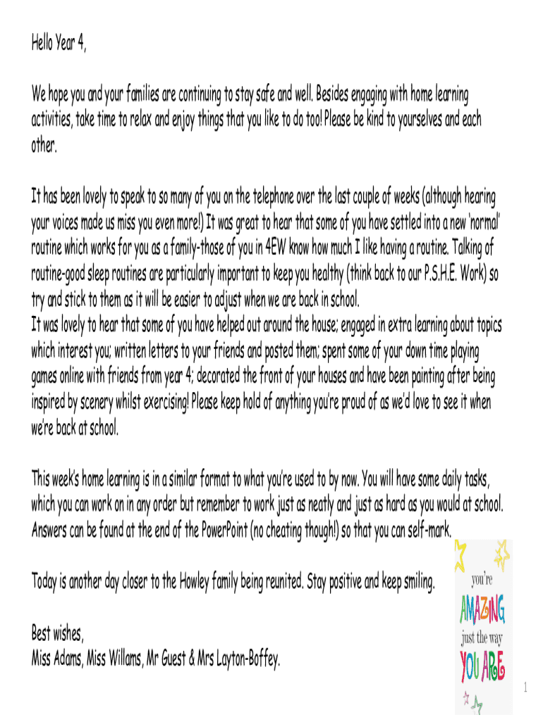 We hope you and your families are continuing to stay safe and well. Besides engaging with home learning