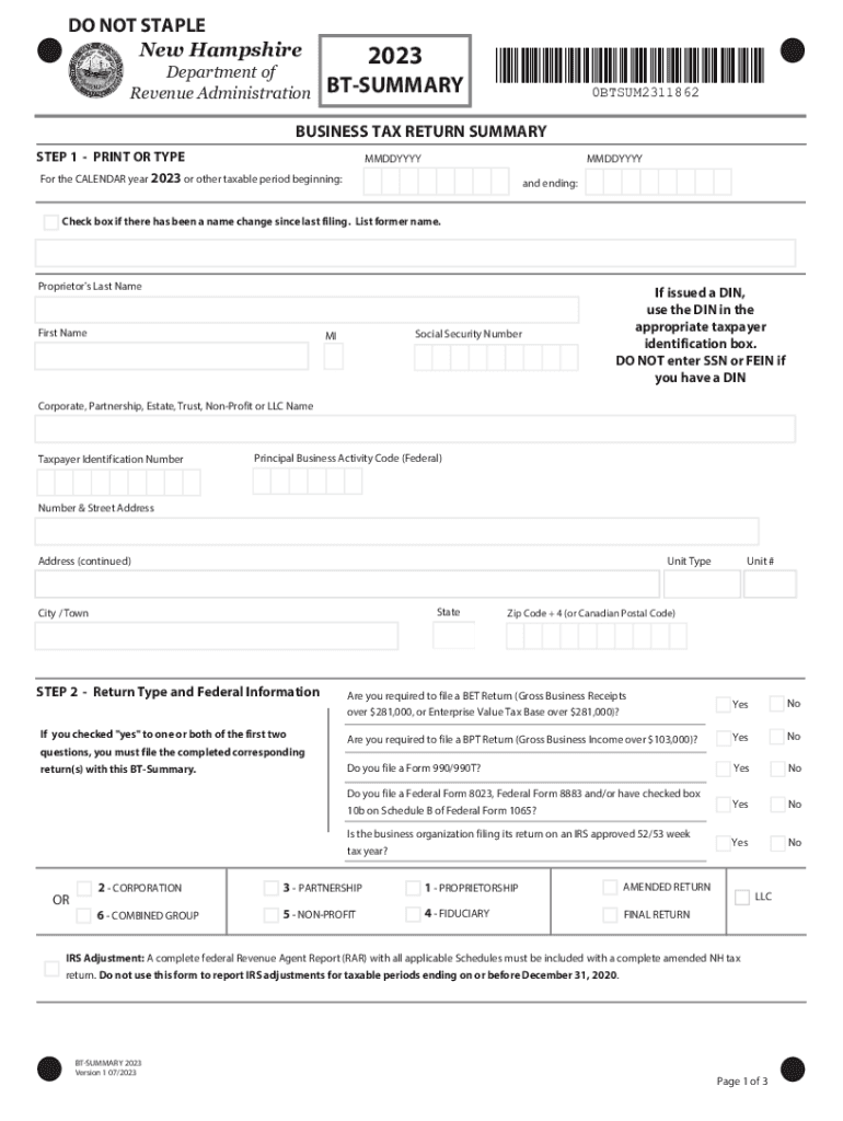 Print FormDO NOT STAPLE New Hampshire Department of Revenue Administration2023 BTSUMMARYReset Form*0BTSUM2311862* 0BTSUM2311862BUSINESS TAX RETURN SUMMARY STEP 1 PRINT OR TYPEMMDDYYYYMMDDYYYYFor the