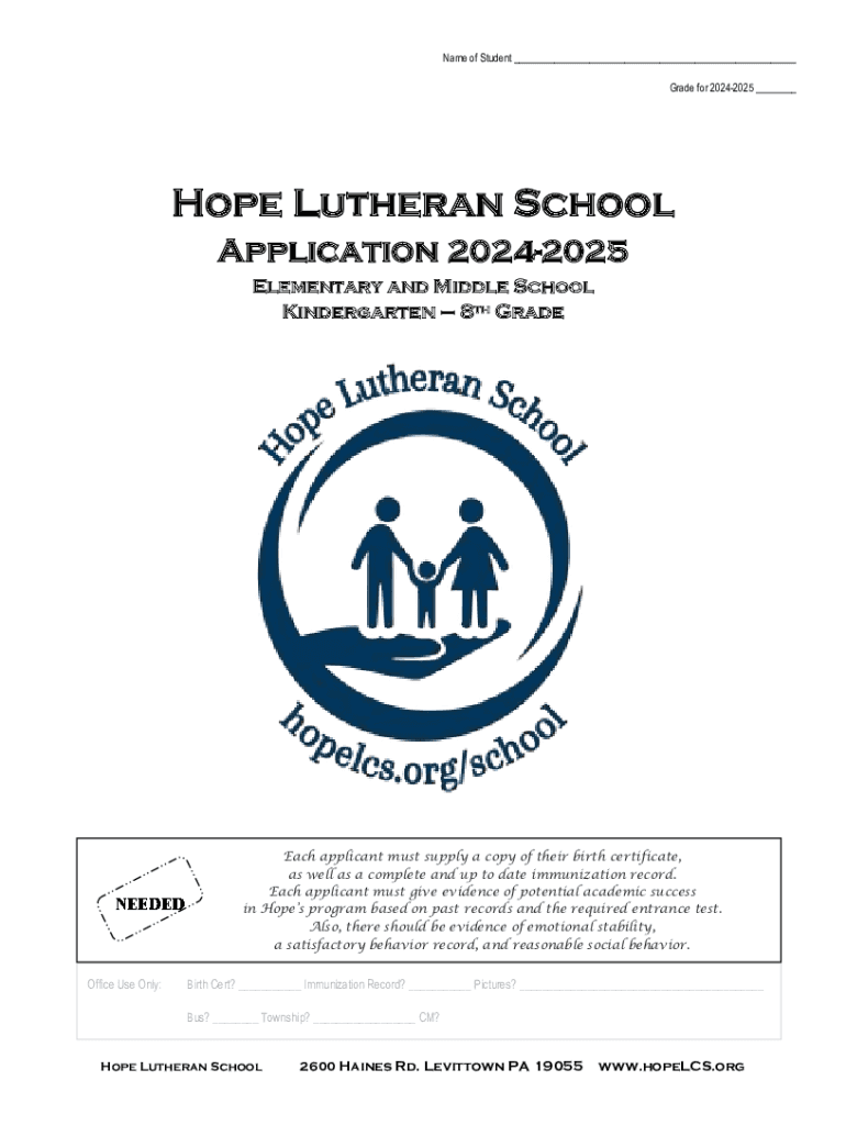 Name of Student ___ Grade for 20242025 ___Hope Lutheran School Application 20242025 Elementary and Middle School Kindergarten 8th GradeEach applicant must supply a copy of their birth certificate,