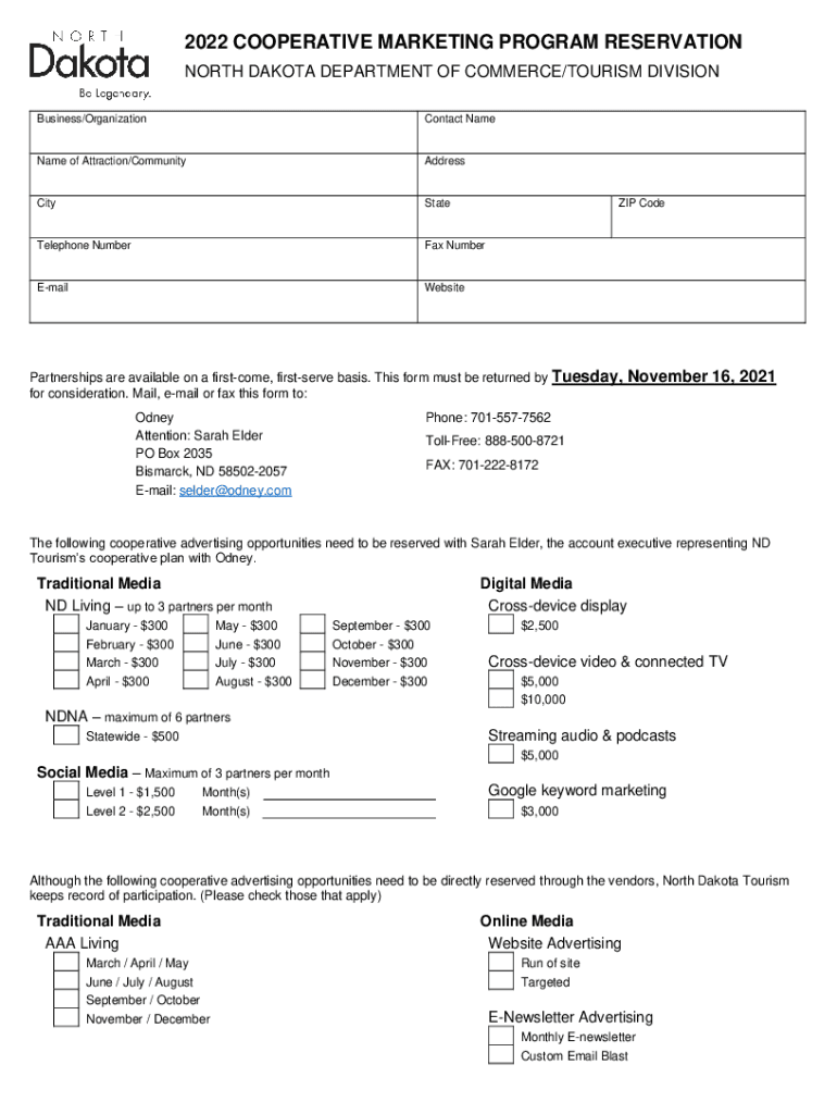 2022 COOPERATIVE MARKETING PROGRAM RESERVATION NORTH DAKOTA DEPARTMENT OF COMMERCE/TOURISM DIVISION Business/OrganizationContact NameName of Attraction/CommunityAddressCityStateTelephone NumberFax