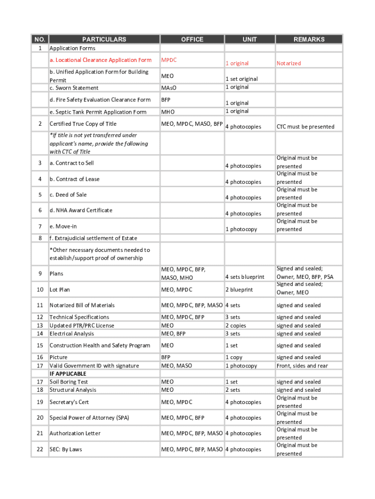 NO. PARTICULARS 1 Application Forms a. Locational Clearance Application Form b. Unified Application Form for Building Permit c. Sworn Statement2OFFICEUNITMPDC1 originalMEO1 set original 1 originalMAsOd.