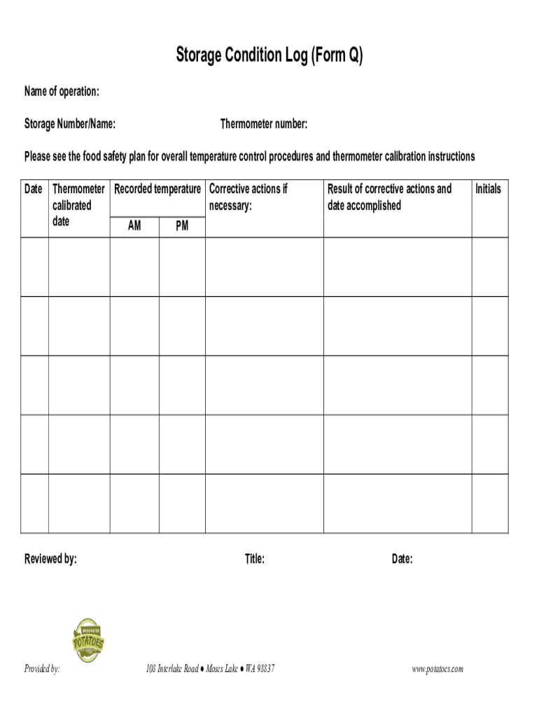 Storage Condition Log (Form Q) Name of operation: Storage Number/Name:Thermometer number:Please see the food safety plan for overall temperature control procedures and thermometer calibration instructions