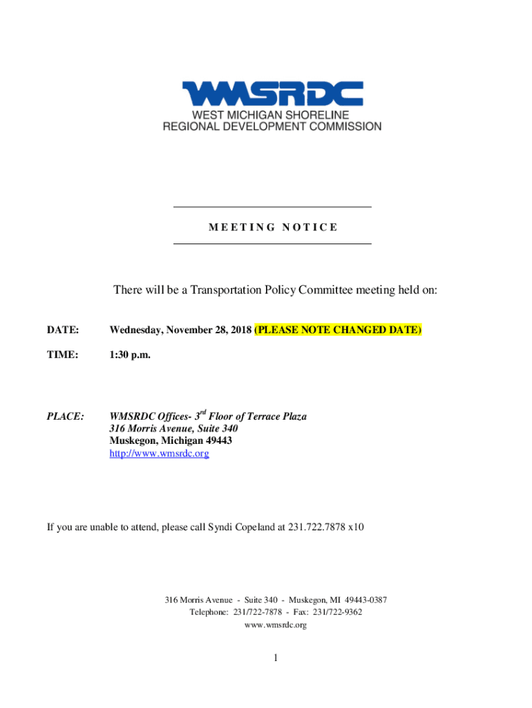 ___ MEETING NOTICE ___There will be a Transportation Policy Committee meeting held on: DATE:Wednesday, November 28, 2018 (PLEASE NOTE CHANGED DATE)TIME:1:30 p.m.PLACE:WMSRDC Offices 3rd Floor of Terrace
