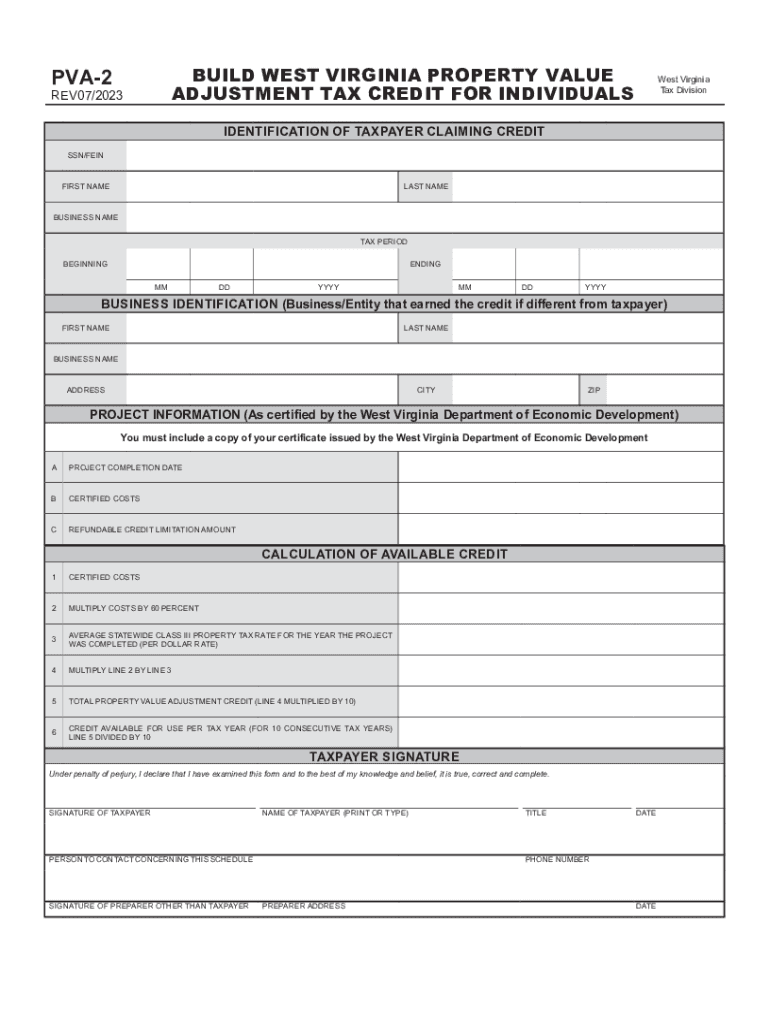 BUILD WEST VIRGINIA PROPERTY VALUE ADJUSTMENT TAX CREDIT FOR INDIVIDUALSPVA2REV07/2023West Virginia Tax DivisionIDENTIFICATION OF TAXPAYER CLAIMING CREDIT SSN/FEINFIRST NAMELAST NAMEBUSINESS NAME