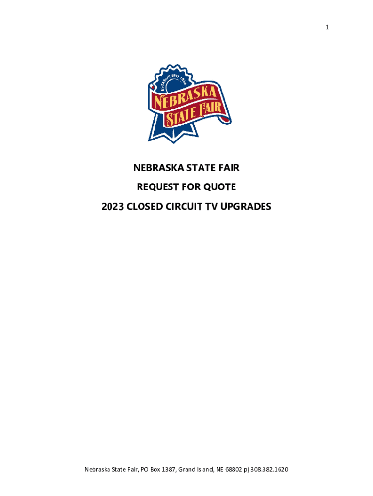 1NEBRASKA STATE FAIR REQUEST FOR QUOTE 2023 CLOSED CIRCUIT TV UPGRADESNebraska State Fair, PO Box 1387, Grand Island, NE 68802 p) 308.382.16202 REQUEST FOR QUOTE CLOSED CIRCUIT UPGRADES NEBRASKA STATE